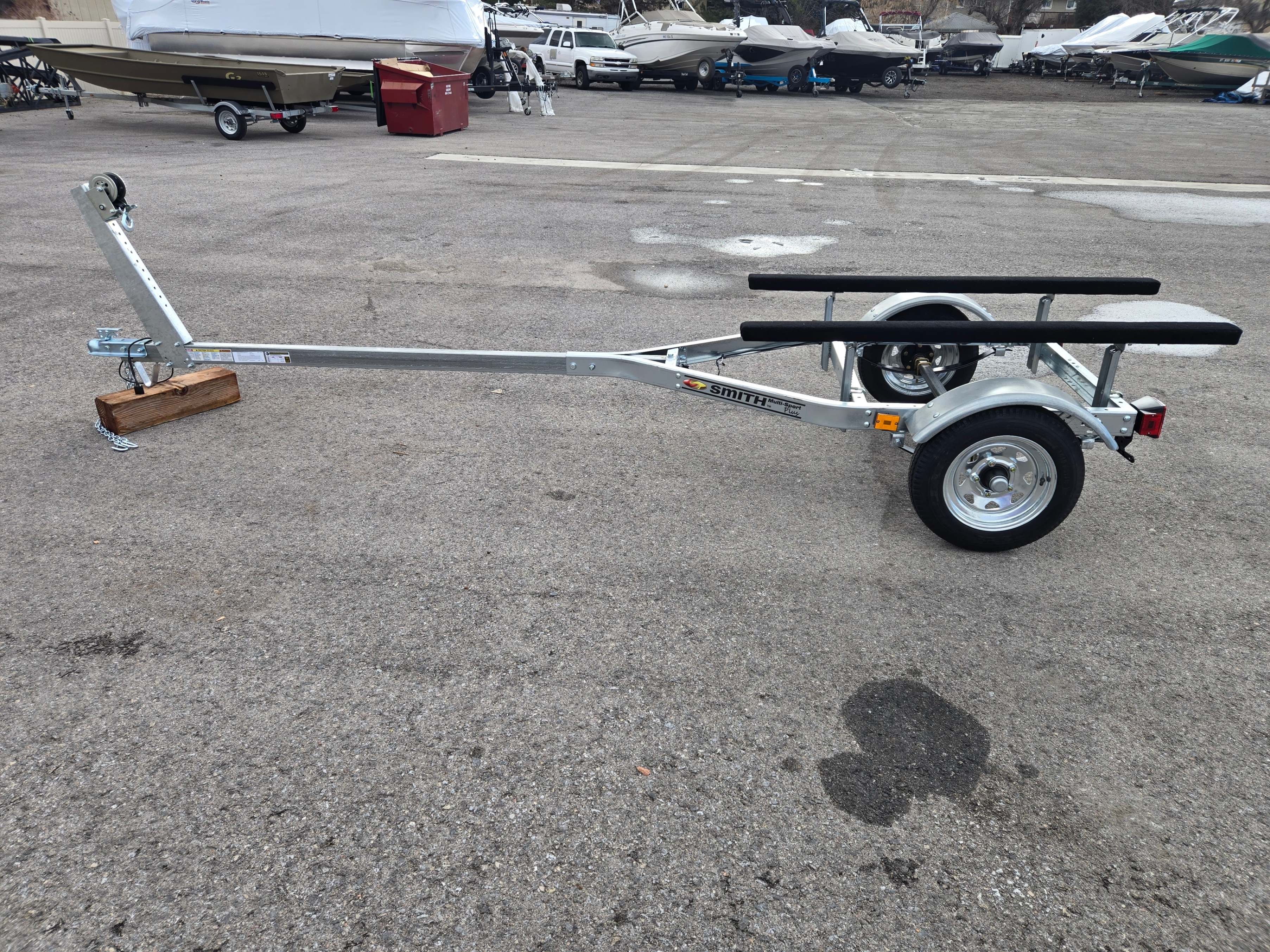 Offers a longer tongue and larger tires than the 48810. This trailer includes everything needed to carry a small boat, inflatable, or PWC up to 14' long. The multi-sport plus trailer's frame is built to carry up to an 800 lb load and includes DOT approved lights, a pair of 5' adjustable carpeted bunk boards with dual adjustable support, winch stand, winch hook and strap, and a hitch coupler with safety chains. The 4.80 x 12" tires are rated for use at highway speeds, and the winch stand can be mounted anywhere along the 86" tongue to balance the load because a properly balanced load is critical for safe trailering. Total overall length 156", overall width 54" RETAIL $2257.00